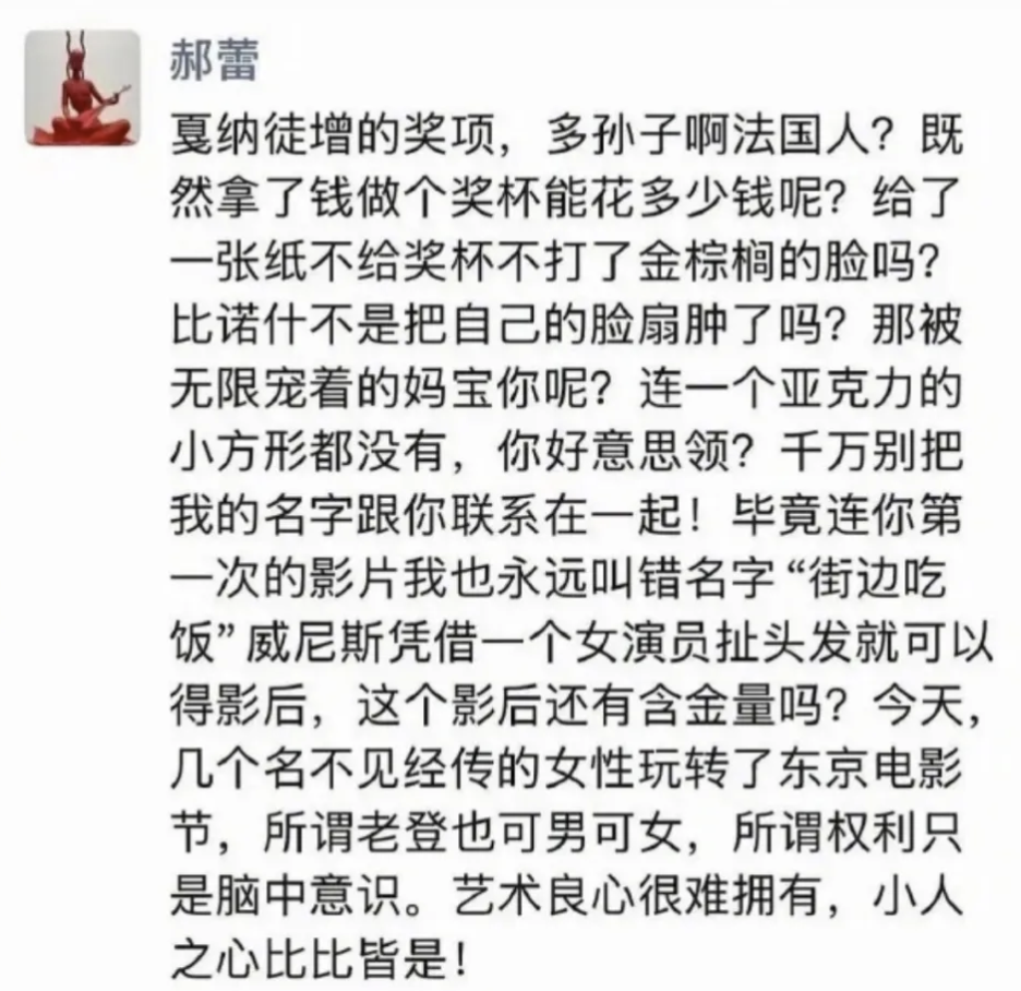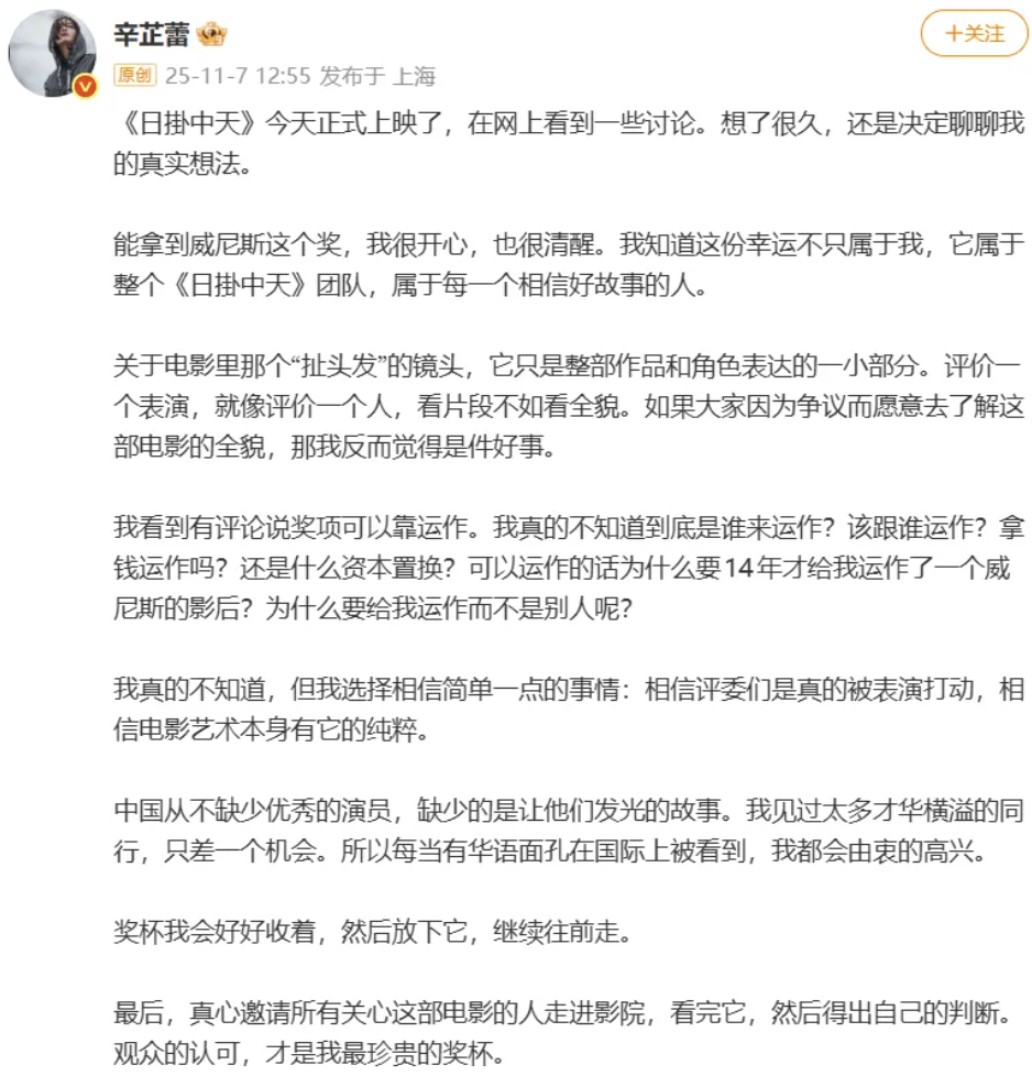 月余前的东京影后之争,让郝蕾跳出来大骂法国人是孙子,并说威尼斯影后没含金量,正抱着奖杯回味的辛芷蕾顿时坐不住了,明牌对阵反驳运作奖项的传言,并表示愿意当面对质。